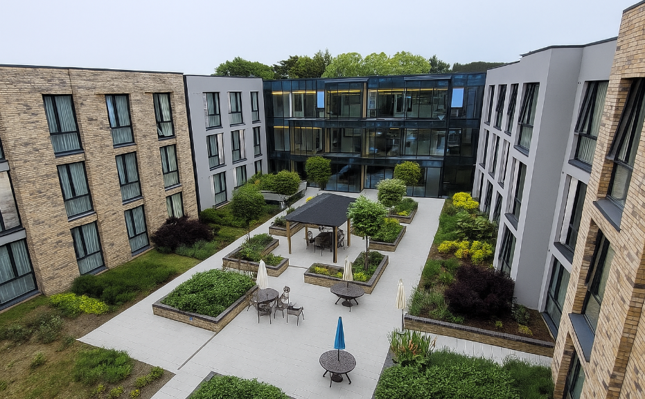 Set within a peaceful suburban setting, this exceptional project centres around a beautifully designed 140-bedroom care facility — a building that balances functionality, elegance, and comfort. Car parking is discreetly integrated within a single-storey basement, which also houses staff facilities, back-of-house areas, and secure cycle storage.